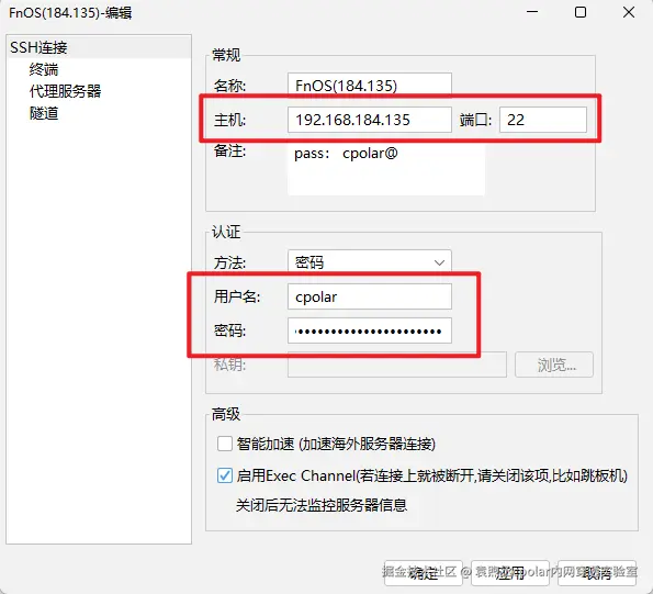 ssh功能打开后,使用shell工具进行远程登录连接,这里以finalshell为例,填写飞牛的相关ssh信息: