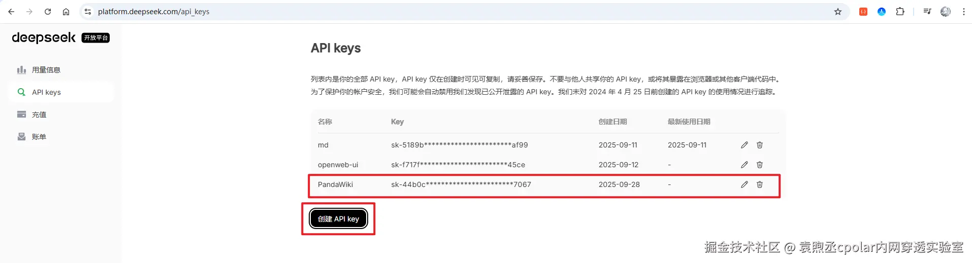 提示需要API Key,我们来到DeepSeek的官网,创建一个API Key: