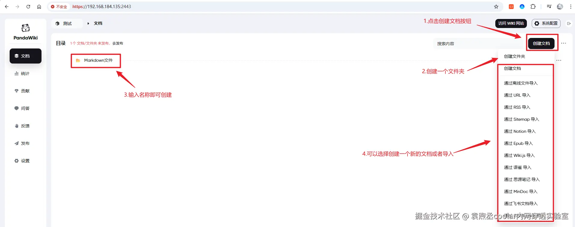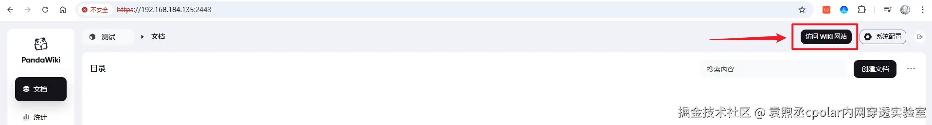 在前面已经配置好啦PandaWiki,接下来我们使用一下PandaWiki,首先点击右上角的创建文档,参考如下图: