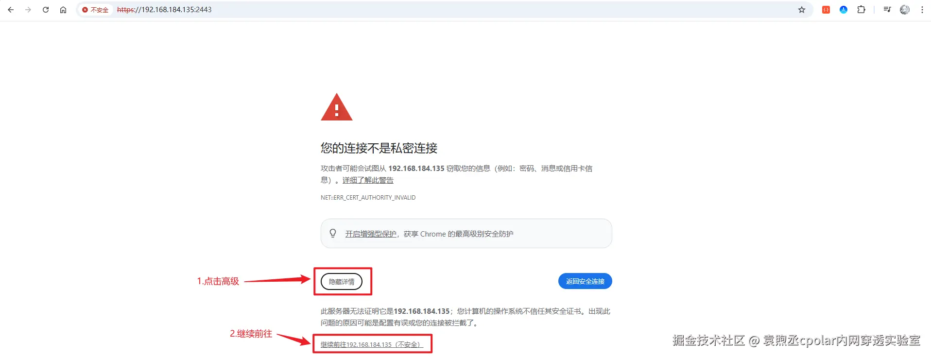 访问给的内网访问地址,如果出现如下不安全提示,点击高级,然后点击继续前往即可: