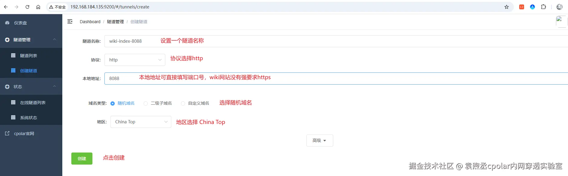 可以看到,配置的端口为8088(即前面手动配置的端口,默认为80),接下来回到cpolar后台,点击创建隧道: