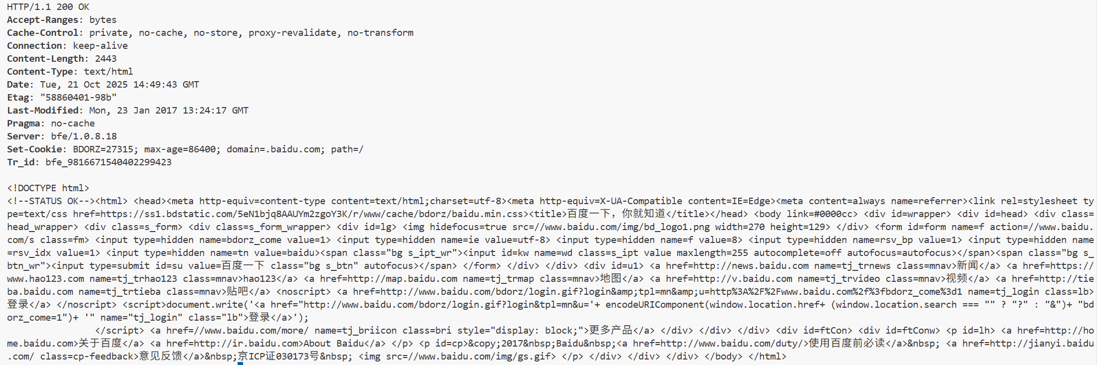 - Body:空行后面的内容都是Body。Body允许为空字符串。如果Body存在,则在Header中会有一个Content-Length属性来标识Body的长度。如果服务器返回了一个 html 页面,那么 html 页面的内容就是在 Body中。