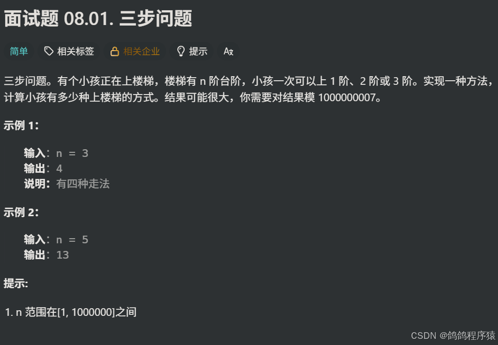 题目链接:⾯试题 08.01. 三步问题](https://leetcode.cn/problems/three-steps-problem-lcci/description/)