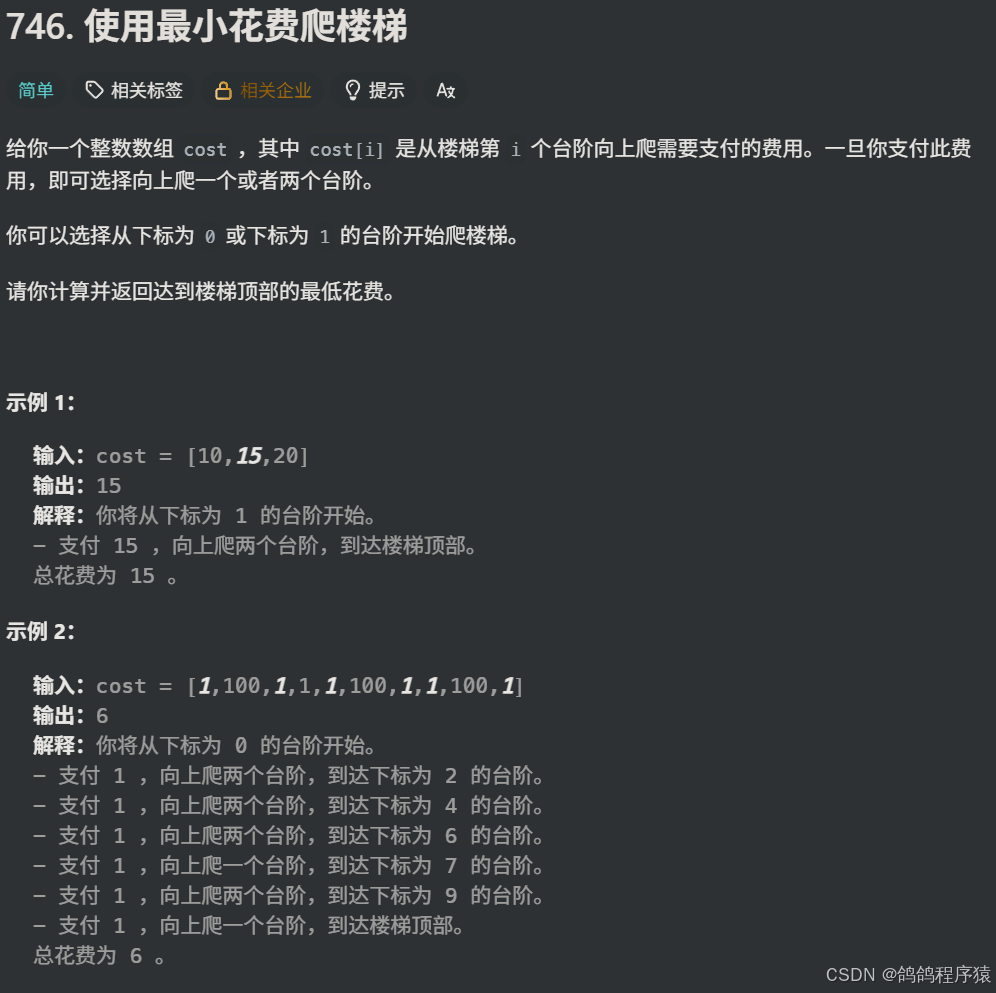 题目链接:746. 使⽤最⼩花费爬楼梯(easy)