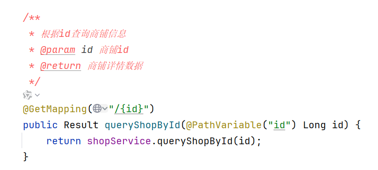 我们现在需要给ShopController的根据id查商铺,即给queryShopById()接口添加Redis缓存。本篇中的其他案例都将以改造该接口为主。