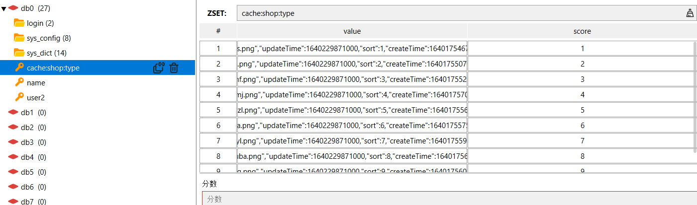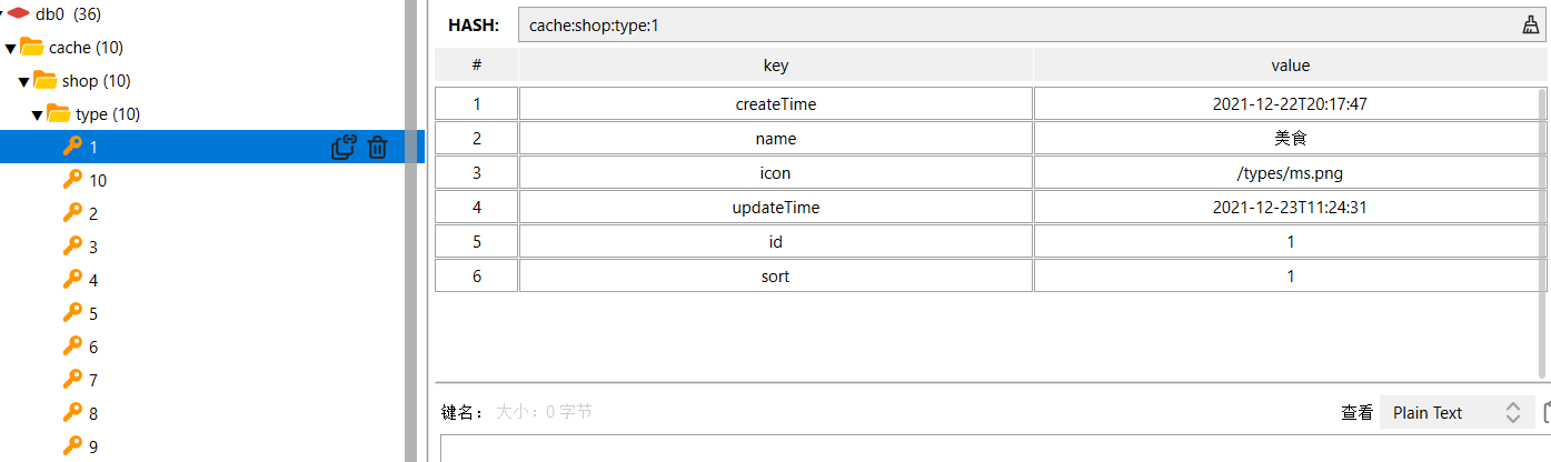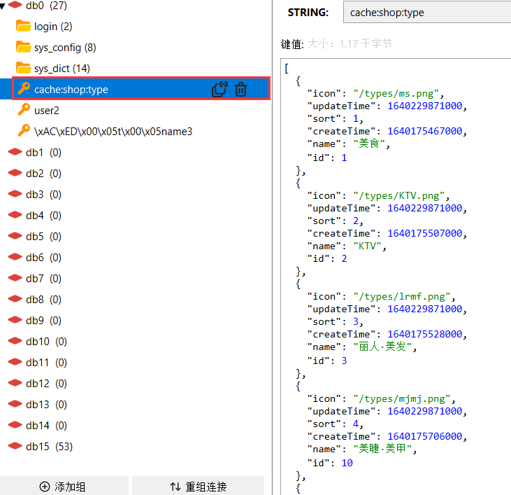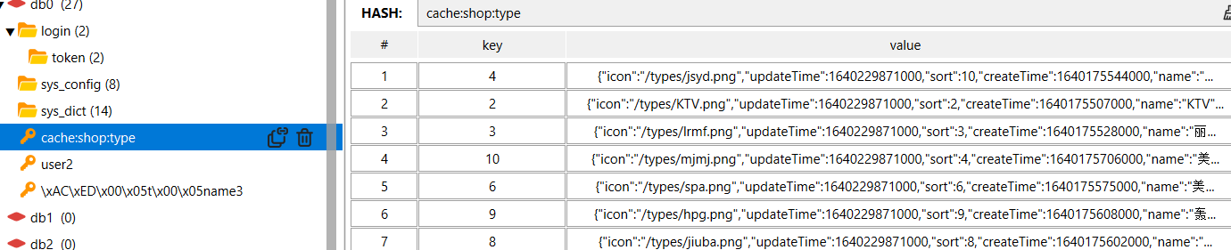 同样,我们如果需要修改数组中一个对象中的指定属性,那么一串JSON格式的字符串显然是不方便修改的,那么我们可以选用Hash结构标识一个ShopType对象,再用多个key标识该数组中的多个对象。