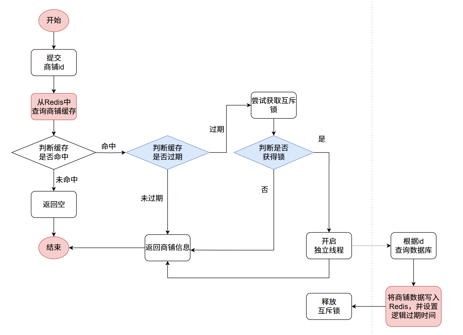 逻辑过期默认数据都是存在的,不会再从数据库中查找新数据放入缓存中,如果缓存中没有查到该数据就直接结束了,不会再经过数据库查询。逻辑过期唯一需要考虑的是:更新数据,也就是根据逻辑时间判断是否需要从数据库中更新数据。