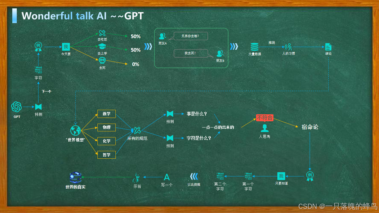 举个例子,我说我今天要:去吃饭,去上学,去死。你会觉得去死这个可能性是很小的,这边吃饭可能性是50%另一边上学可能是50%。因为你不可能说:兄弟你去哪儿?我去死!不可能对不对,所以说它是通过大量的数据去推测人的习惯。这个叫"世界模型",他会知道这个世界的数学、物理、化学、哲学,以及所有的规范,我根据这个规范,来预测下一件事是什么?下一个字符是什么?所以它就是一点一点的出来的,像打字一样,就这件事情,好像是不符合人的思考的,就有点宿命论了,难道我只要知道第一个字符,我就能知道第二个字符,以此类推,我是不是写出来一个A之后,那我应该吧莎翁的所有作品都写出来了呀。不好意思,这有可能就是世界的真实。