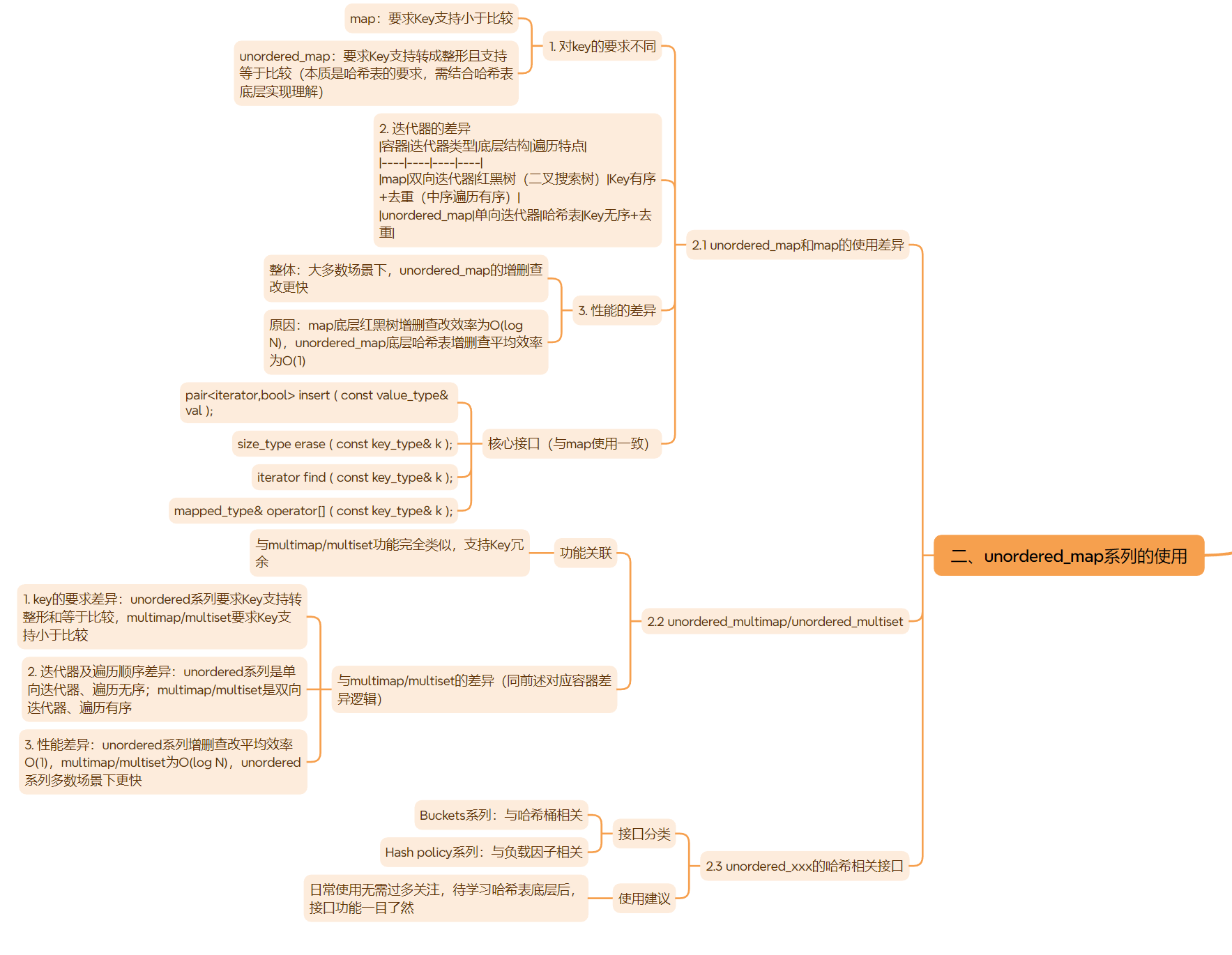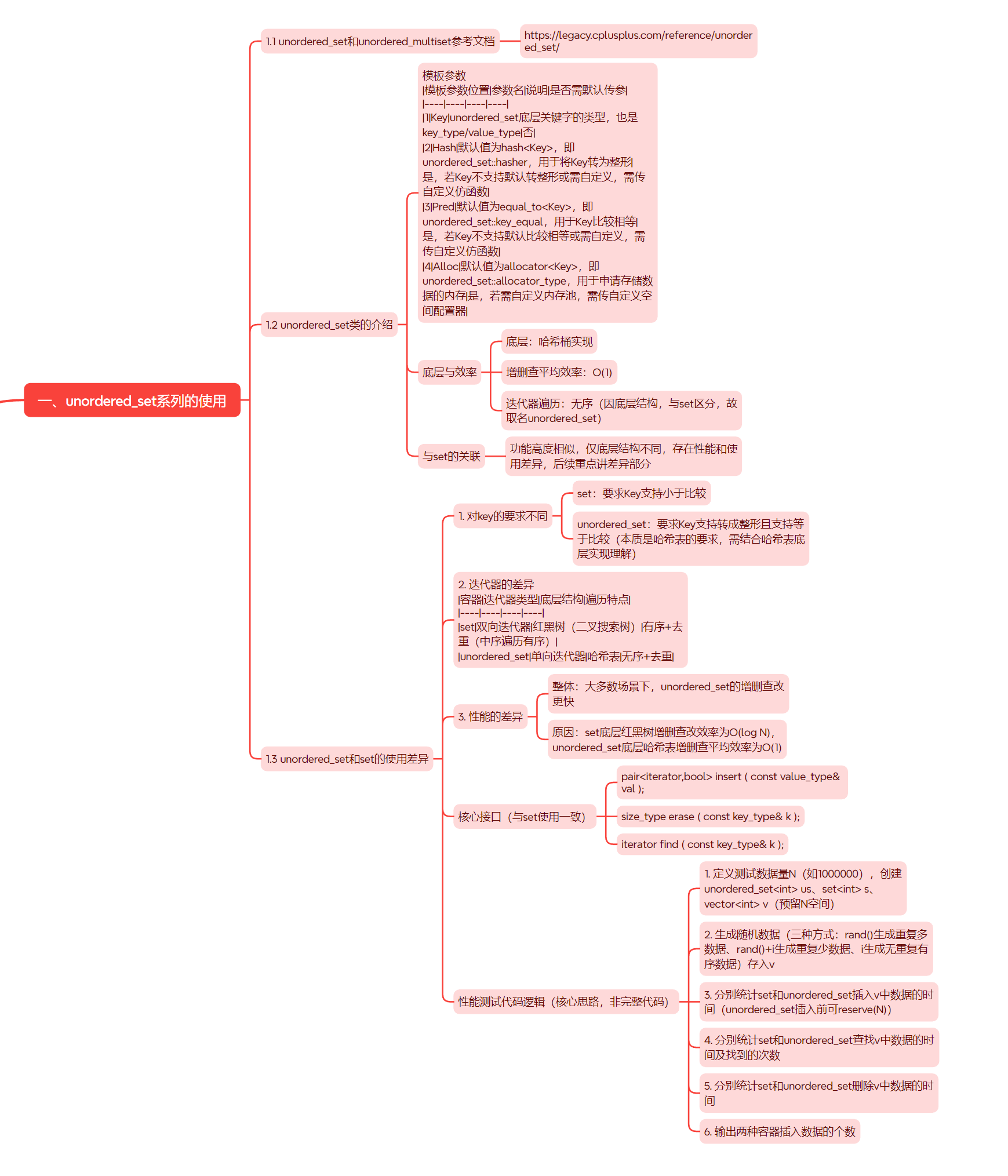 | 与对应有序容器区别 | 和set的区别:1. 底层:哈希表 vs 红黑树2. 键要求:支持转为整型且可比较 vs 仅需支持比较3. 迭代器:单向 vs 双向;元素无序 vs 有序4. 性能:增删查改平均 O (1) vs O (log N) |
