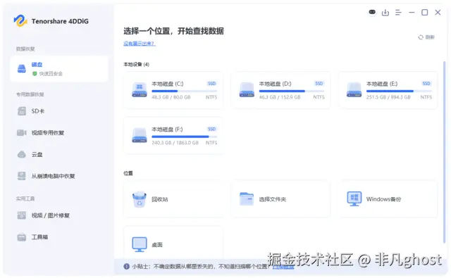 Tenorshare 4DDiG 是一款专业的数据恢复软件,旨在帮助用户从各种存储设备中恢复丢失或误删除的数据。无论是因为误操作、格式化、系统崩溃还是病毒感染导致的数据丢失,4DDiG都能提供有效的解决方案。它支持多种文件类型和存储介质,包括硬盘驱动器、USB闪存盘、SD卡、数码相机等。