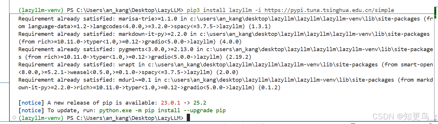 在控制台中输入**pip3 install lazyllm -i https://pypi.tuna.tsinghua.edu.cn/simple**` `,等待安装结束。
