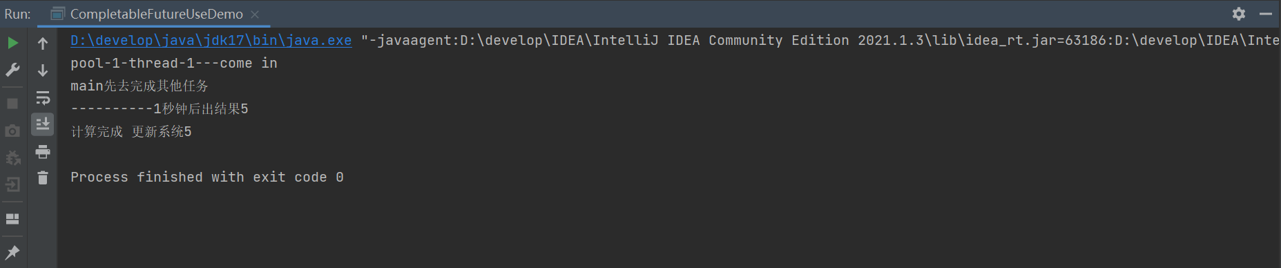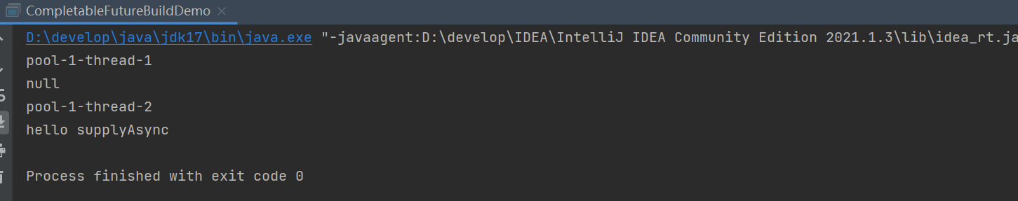 ExecutorService executorService = Executors.newFixedThreadPool(3);CompletableFuture<Void> completableFuture = CompletableFuture.runAsync(() -> { System.out.println(Thread.currentThread().getName()); try { TimeUnit.SECONDS.sleep(1); } catch (InterruptedException e) { e.printStackTrace(); } },executorService); System.out.println(completableFuture.get()); //null CompletableFuture<String> objectCompletableFuture = CompletableFuture.supplyAsync(()->{ System.out.println(Thread.currentThread().getName()); try { TimeUnit.SECONDS.sleep(1); } catch (InterruptedException e) { e.printStackTrace(); } return "hello supplyAsync"; },executorService); System.out.println(objectCompletableFuture.get());//hello supplyAsync executorService.shutdown(); }}