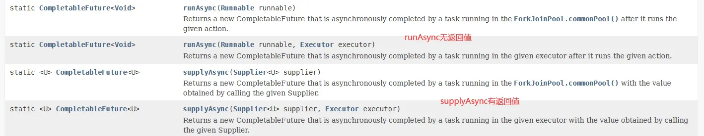 runAsync无返回值public static CompletableFuture<Void> runAsync(Runnable runnable)
