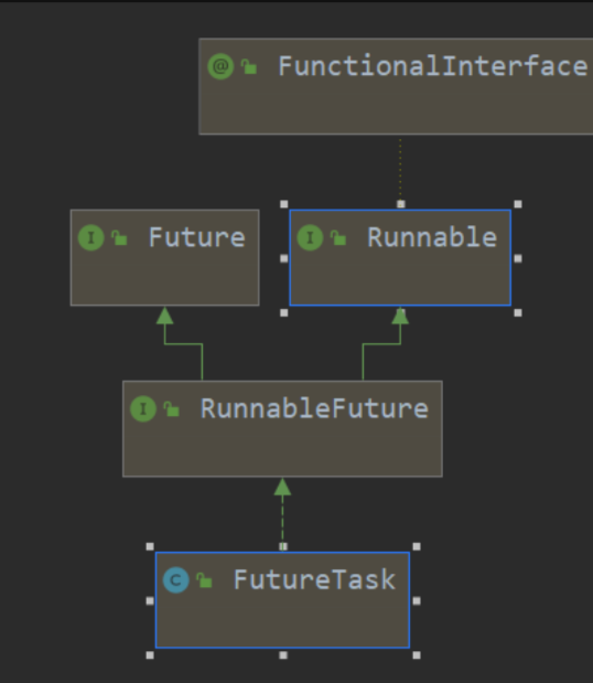 FutureTask作为Future的实现类,继承了RunnableFuture接口,而RunnableFuture接口又继承了Future和Runnable接口;在FutureTask,即Future的落地实现类中,重写了run()方法,并在这个重写的run()方法中调用了callable方法,这样便可以解决返回值的问题。- 从