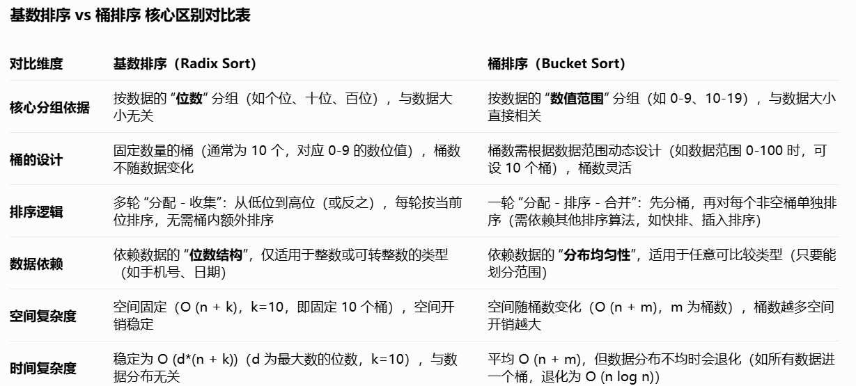 总结:基数排序是 "按位拆分,多轮排序",桶是固定的,不依赖数据分布;桶排序是 "按范围分桶,一次排序",桶是灵活的,依赖数据均匀分布。