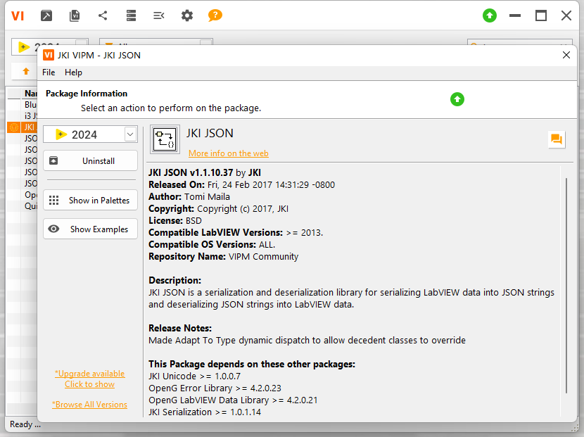 从VIPM安装JKI JSON//通信是基于JSON格式的