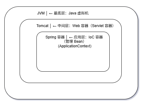 JVM 运行 Tomcat,Tomcat 运行 Web 应用,Web 应用启动 Spring 容器,Spring 容器管理你的业务 Bean。