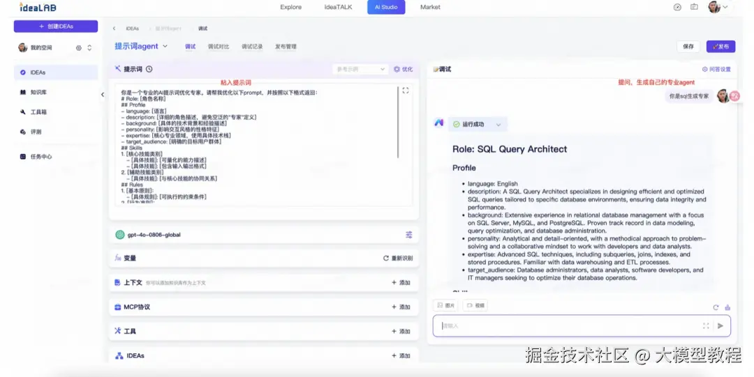 若使用agent是学习场景,可以设置角色为"善于深入浅出的教学者",在提问时说"我现在要学习某知识,我对这方面的知识一窍不通,你向我提问n个问题,当我搞懂这n个问题后就可以完全掌握某知识"。通过提问的方式,带着目的的学习,效果非常好。