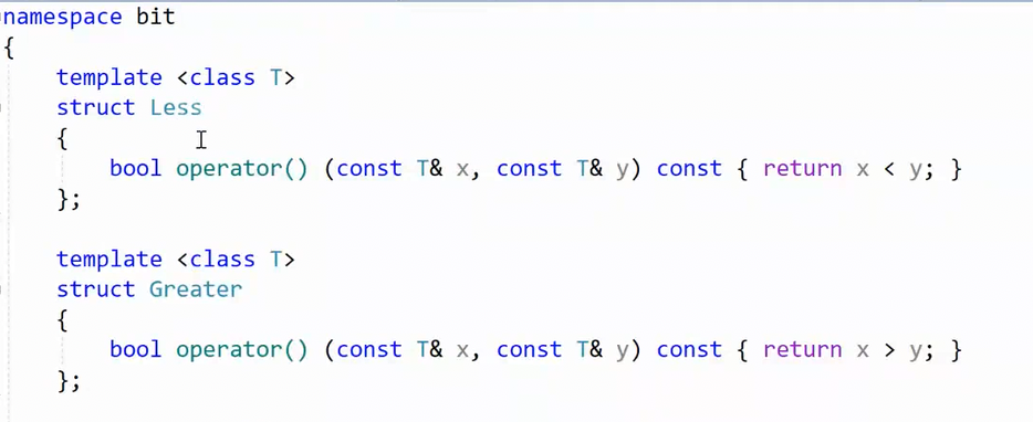struct Less是一个模板结构体,内部重载了operator()运算符。这使得Less的对象可以像函数一样被调用,因此称为 "函数对象"。 -