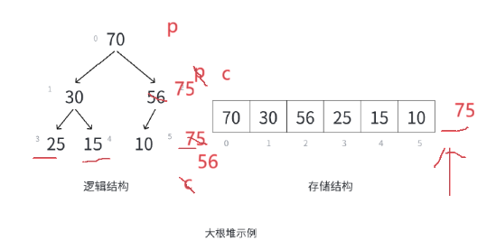 上图假设插入的数字是75,向上调整结束之后,75会在根节点的位置