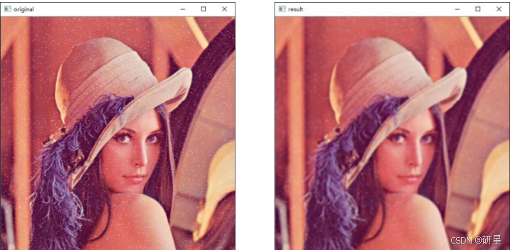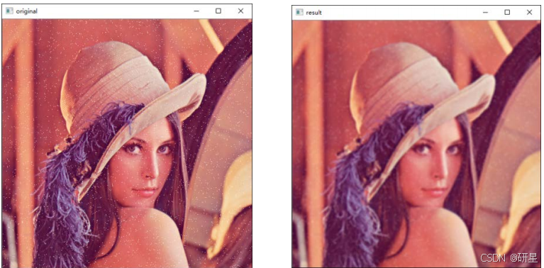 读取一幅噪声图像,使用函数 cv2.blur()对图像进行均值滤波处理,得到去噪图像,并显示原始图像和去噪图像。