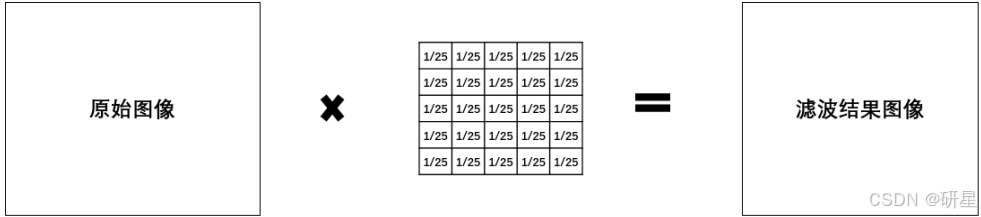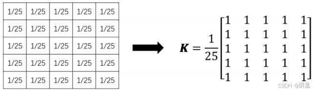 根据上述运算,针对每一个像素点,都是与一个内部值均为 1/25 的 5×5 矩阵相乘,得到均值滤波的计算结果