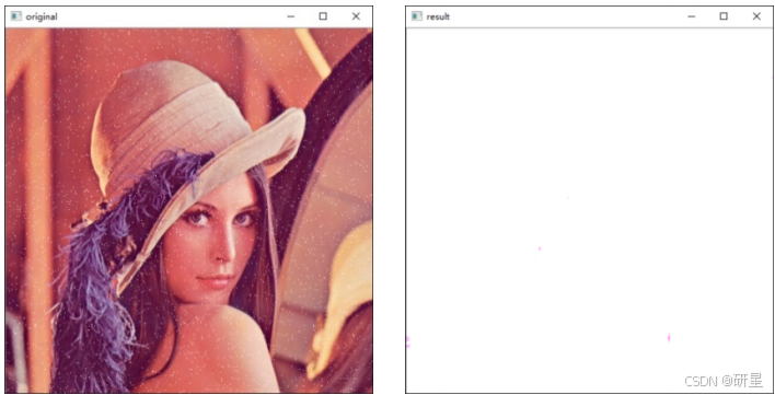 针对噪声图像,在方框滤波函数 cv2.boxFilter()内将参数 normalize 的值设置为 0,显示滤波处理结果。