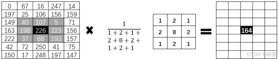 在进行均值滤波和方框滤波时,其邻域内每个像素的权重是相等 的。在高斯滤波中,会将中心点的权重值加大,远离中心点的权重值减小,在此基础上计算邻域内各个像素值不同权重的和。