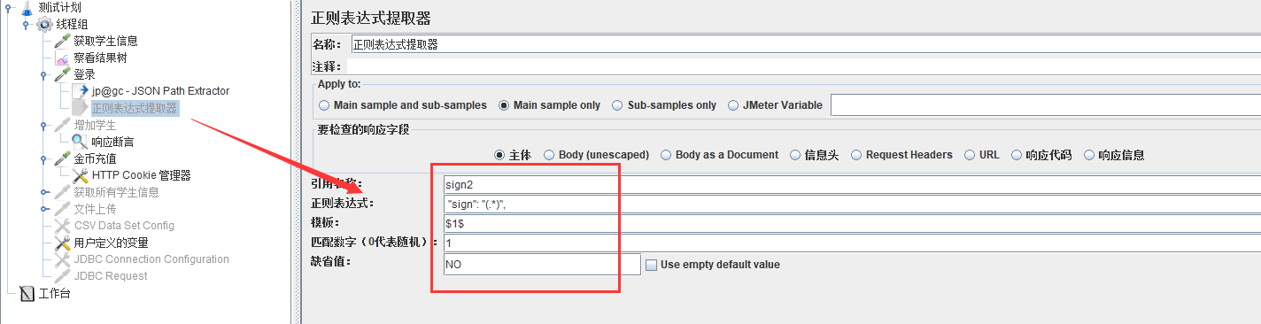 输入对应的值, "jp@gc - JSON Path Extractor" 中类似,将"引用名称"输入"sign2",以保证和"HTTP Cookie 管理器"的一致。将正则表达式中的式用login 接口返回的 "sign": "cd2b43f1688e472e3a516b5a2c6831e8", 中的一串码用(.*) 替换即可。
