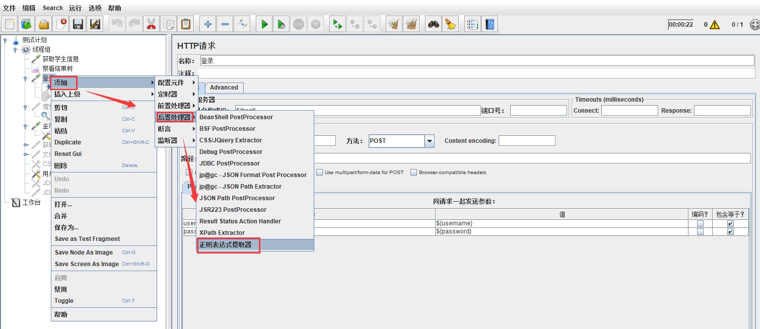 3.2 右键"登陆" -> "后置处理器 -> "正则表达式提取器"