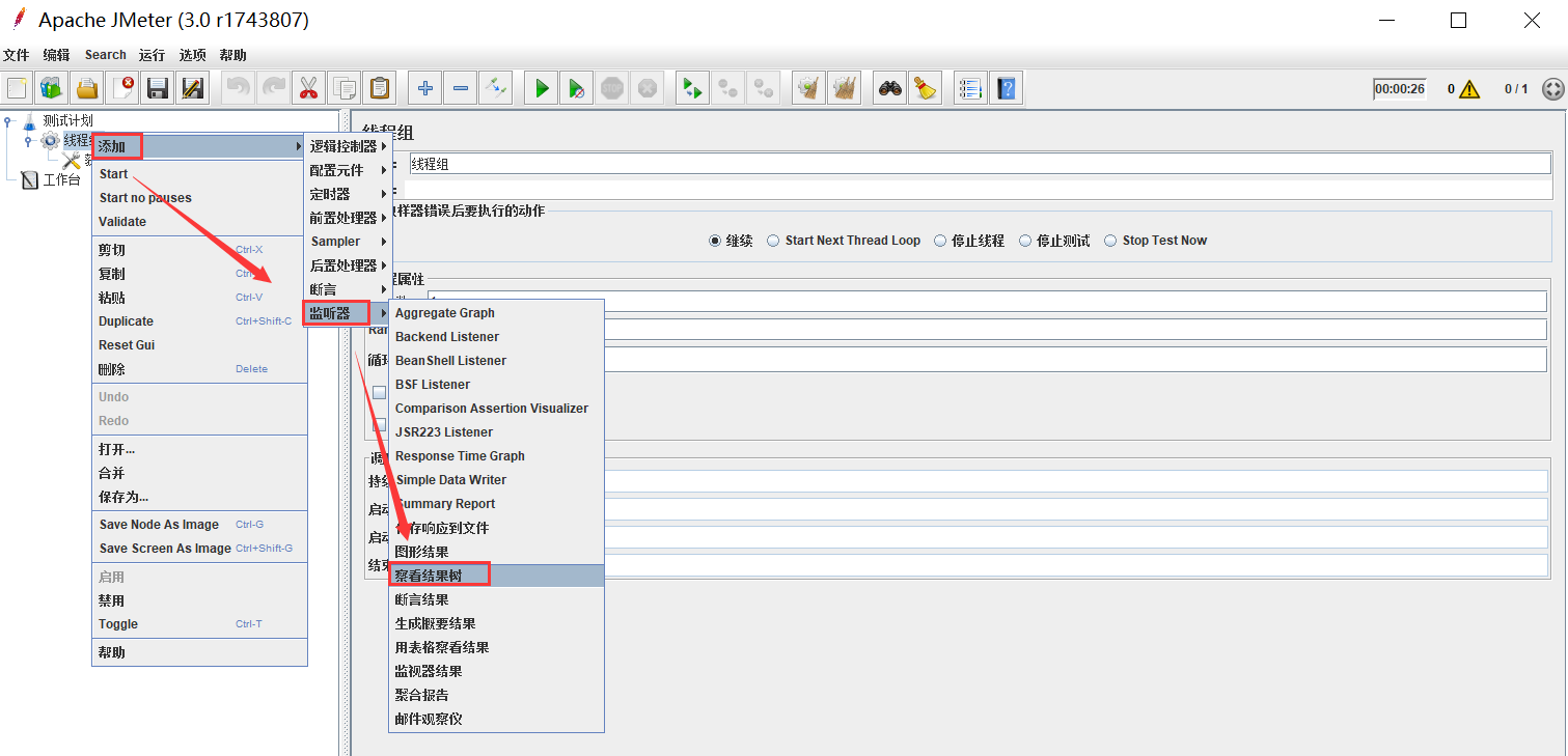 右键"线程组" -> "添加" -> "监听器" -> "察看结果数", 添加"察看结果数", 以察看运行后的结果,如果所示。