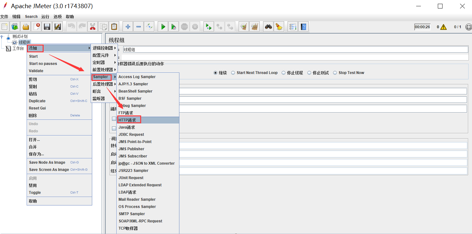 右键"线程组" -> "添加" -> "Sample" -> "HTTP请求", 输入"服务器名称或IP",对应的端口号,http默认端口号80,可以不写。