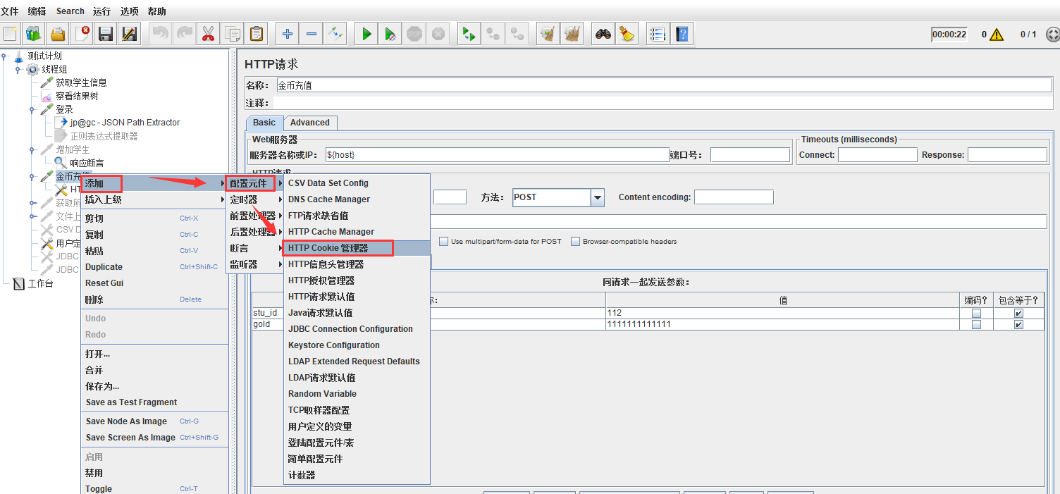添加"HTTP Cookie 管理器" 方法如下图所示, 右键"金币充值" -> "添加" -> "配置元件" -> "HTTP Cookie 管理器"