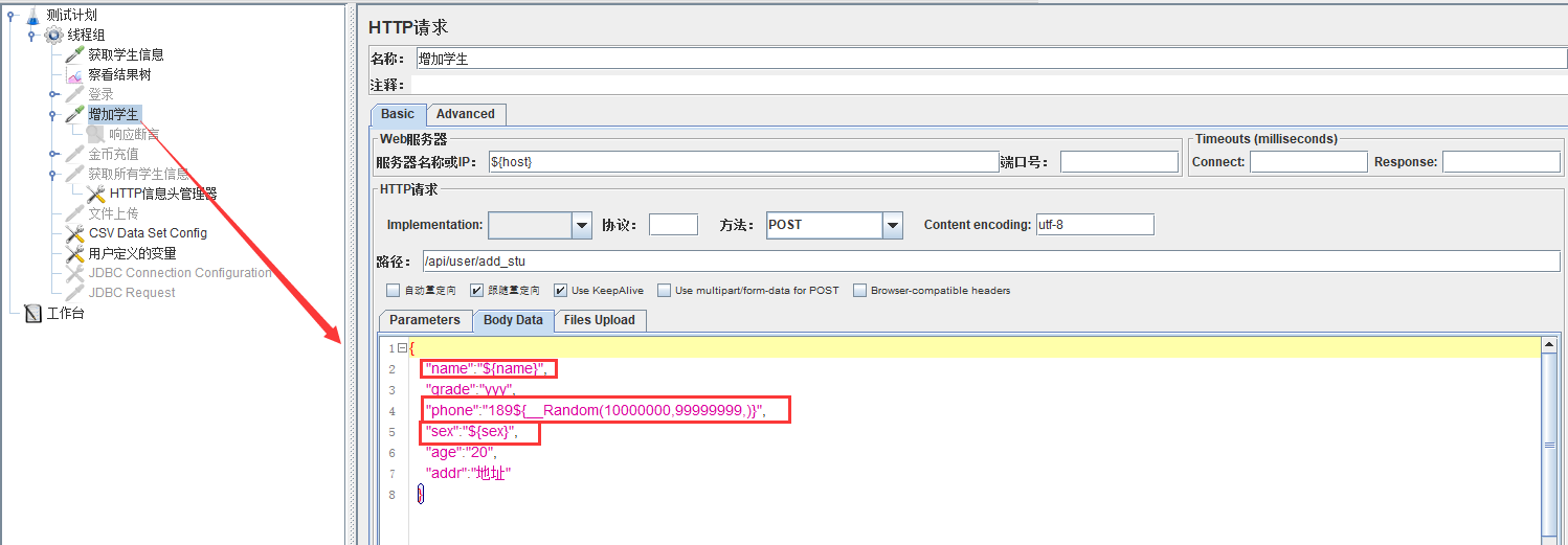 由于"CSV Data Set Config"中的变量名为name 和sex,因此在"增加学生"接口的"Body Data" 中将值分别替换为{name}, {sex}。