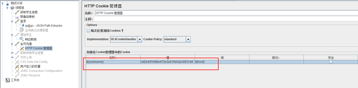 以下图中的"获取所有学生信息" 为例,右键"获取所有学生信息" -> "添加" -> "配置元件" -> "HTTP Cookie 管理器" , 输入对应的名称和值即可。