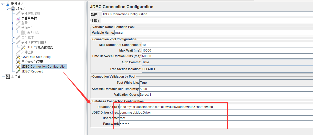 添加一个"JDBC Connection Configuration", 根据上表中对mysql的要求设置下图的值。