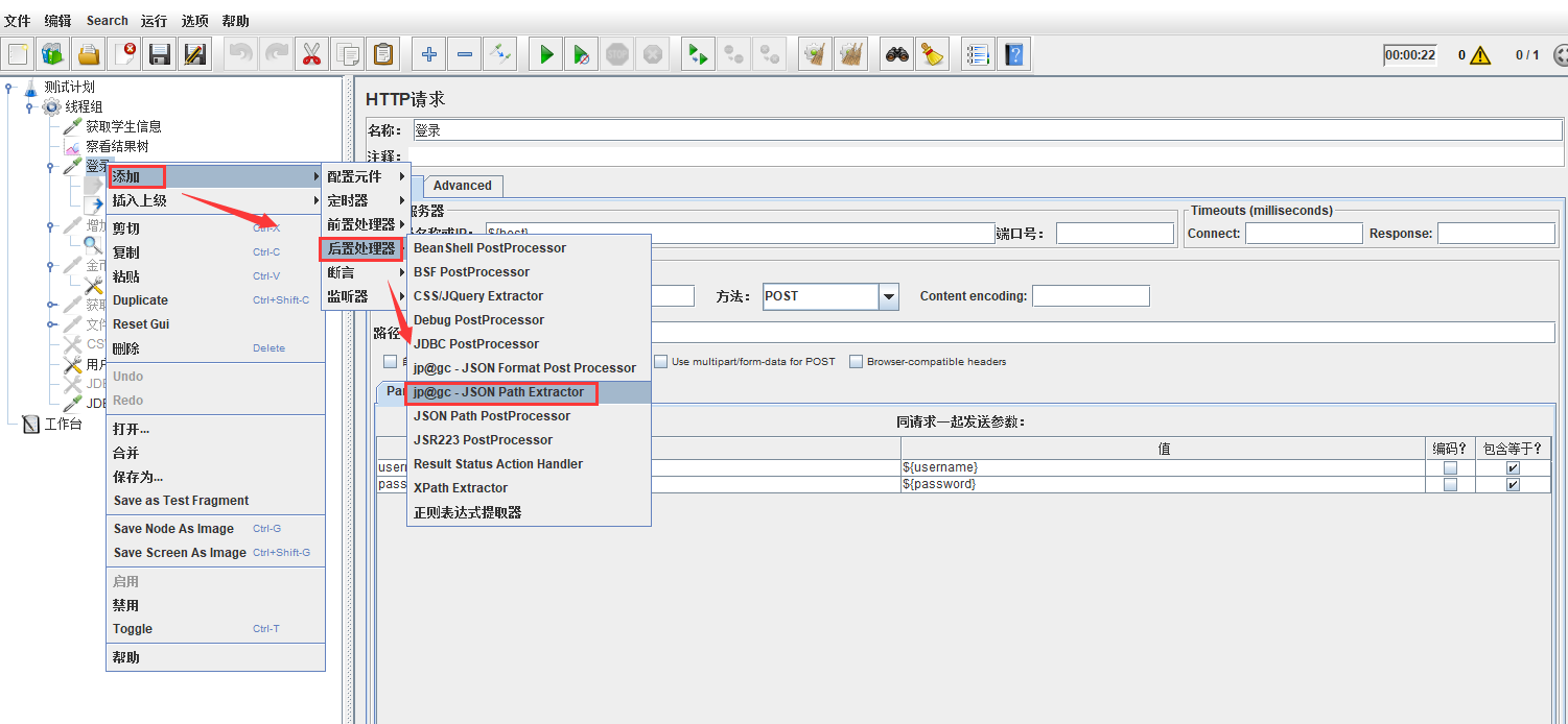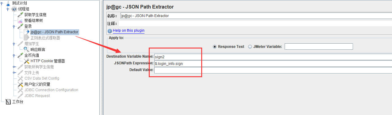 右键"登陆" -> "后置处理器 -> "jp@gc - JSON Path Extractor"