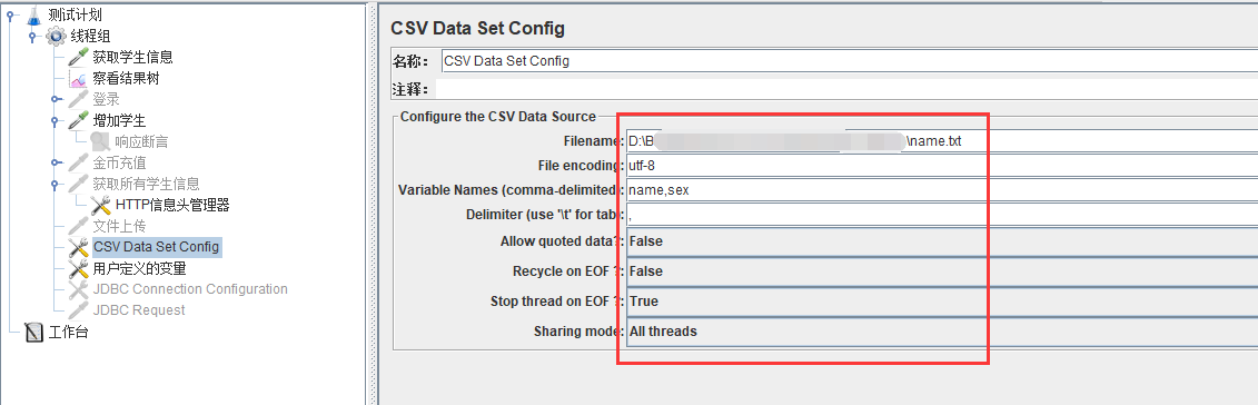 右键"线程组" -> "添加" -> "配置元件" -> "CSV Data Set Config",如果仅应用于"增加学生"接口的话,可以直接在"增加学生"接口下面创建"CSV Data Set Config"。