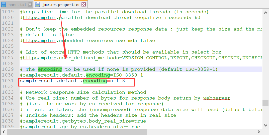 **注意点:修改Jmeter 中的中文乱码要将"\bin" 路径下的"jmeter.properties" 文件中设置为 "sampleresult.default.encoding=utf-8",如下所示。