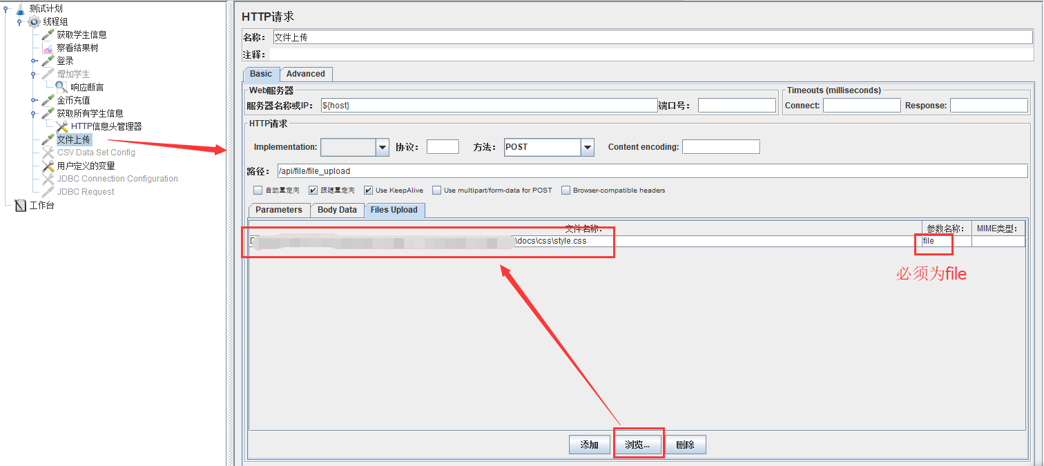 与其他POST请求中添加key-value, json 数据不同的是,这个需要在HTTP 请求中点击"Flies Upload" tab, 点击"添加", 然后通过"浏览"上传本地的文件。