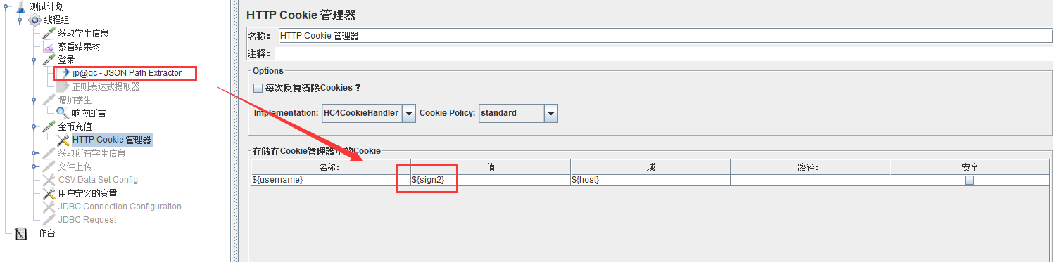 因此需要在"HTTP Cookie 管理器"中将{username}的值输入{sign2},代替之前手动输入的那一串码。