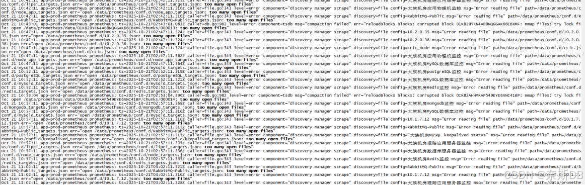 - 描述: Prometheus大面积获取监控数据失败,查看/var/log/messages系统日志记录,有大量的too many open files报错