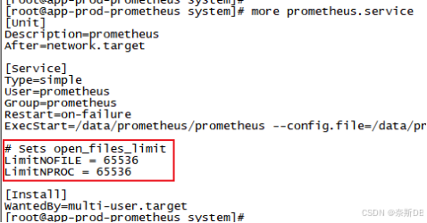 - 解决办法: 从systemd v230 开始,PAM 和 1imits.conf 对服务进程不再生效,systemd 服务的资源限制优先由systemd 配置控制,而不是limits.conf。这也就导致了在 /etc/security/limits.conf 文件中配置的参数不会对通过 systemctl 启动的服务进程生效,因此 limits.conf 文件中配置的参数只会对通过登录shell启动的用户进程有效(如 SSH 登录后运行命令)和直接在命令行中启动的服务有效(启动命令直接在命令行中执行的,不是通过systemctl服服务启动的)。对于systemd管理的服务(systemctl status service服务)其资源限制由 systemd 自身配置决定,完全忽略 /etc/security/limits.conf 文件中的配置,需要在配置启动参数文件时加上对limited的限制。必须要加上对"打开文件数"的limited限制,不然在Prometheus监控的机器多了的时候会在/var/log/messages系统日志记录大量的too many open files报错。