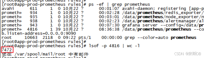 sql[root@app-prod-prometheus ~]#ps -ef | grep prometheus [root@app-prod-prometheus ~]#lsof -p 4816 | wc -l ###统计这个进程打开的文件总数(包括网络连接、管道、共享库等)。可以看到Prometheus相关进程总共打开了七千+个文件(包括网络连接、管道、共享库等)