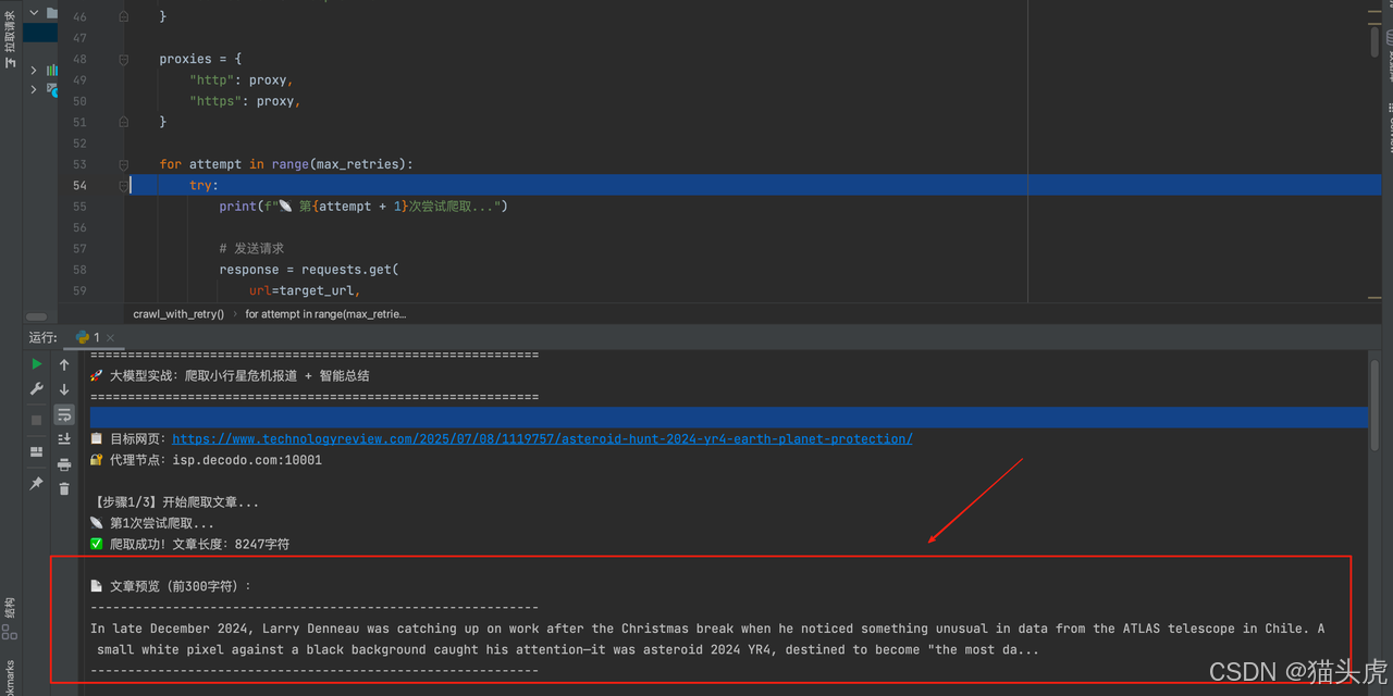 那么,如何突破采集瓶颈?这时,一个好用的代理IP就显得尤为重要。它不仅能帮你绕过各种访问限制,更能直接提升所获数据的质量和多样性。本文将通过一个真实案例------爬取MIT Technology Review关于小行星2024 YR4的专题报道,并用 大模型 智能提炼核心信息,告诉你:选对代理+用好大模型,真的事半功倍。
