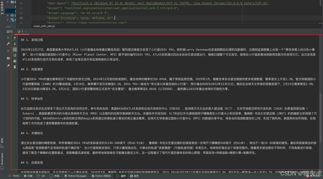 任务价值: 该报道详细记录了2025年初一场真实的"太空危机"------小行星2024 YR4因"3.1%撞击地球概率"登上全球热搜,最终在两个月内被科学家排除威胁。通过代理爬取+大模型分析,可以快速还原这场科学协作的全过程,为天文科普、风险评估、科技报道分析等场景提供参考。