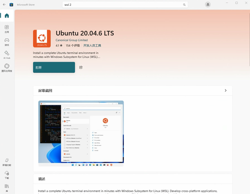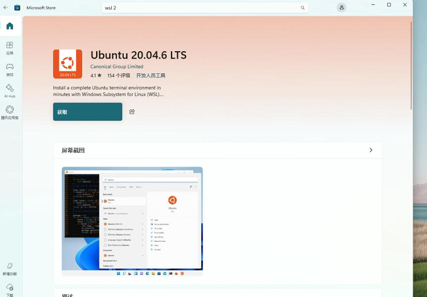 进入store输入wsl, 选一个不高不低的版本吧 ubuntu20.04.6,哪怕docker部署不成功,我也可以方便的部署工具,比widnow上面方便