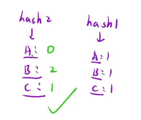 判断:hash2的有效字符大于等于hash1的时候 才出窗口