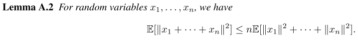 要证明引理 Lemma A.2 :对于随机变量 x 1 , x 2 , ... , x n x_1, x_2, \ldots, x_n x1,x2,...,xn,有 E [ ∥ x 1 + x 2 + ⋯ + x n ∥ 2 ] ≤ n ( E [ ∥ x 1 ∥ 2 ] + E [ ∥ x 2 ∥ 2 ] + ⋯ + E [ ∥ x n ∥ 2 ] ) \mathbb{E}\left[\left\|x_1 + x_2 + \cdots + x_n\right\|^2\right] \leq n\left(\mathbb{E}\left[\left\|x_1\right\|^2\right] + \mathbb{E}\left[\left\|x_2\right\|^2\right] + \cdots + \mathbb{E}\left[\left\|x_n\right\|^2\right]\right) E[∥x1+x2+⋯+xn∥2]≤n(E[∥x1∥2]+E[∥x2∥2]+⋯+E[∥xn∥2]),步骤如下: