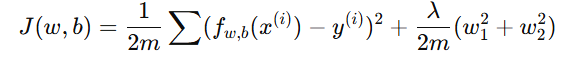 如果模型过拟合,说明参数 w1,w2 过大。使用正则化后,代价函数变为: